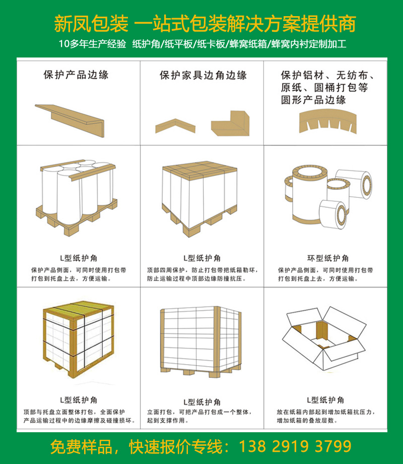 惠州市新鳳包裝材料有限公司是一家專業(yè)生產(chǎn)和銷售紙護(hù)角、紙卡板、和包裝物料的公司。產(chǎn)品包括:紙護(hù)角、紙卡板、滑托板、蜂窩紙板、蜂窩包裝箱等系列包裝材料。產(chǎn)品適用于單元集中包裝和加強(qiáng)產(chǎn)品的防護(hù),具有價(jià)廉,量輕,堅(jiān)固,環(huán)保等顯著特點(diǎn),廣泛應(yīng)用于金屬業(yè),木制品業(yè),食品業(yè),家電業(yè),高科技產(chǎn)品物體的包裝運(yùn)輸。